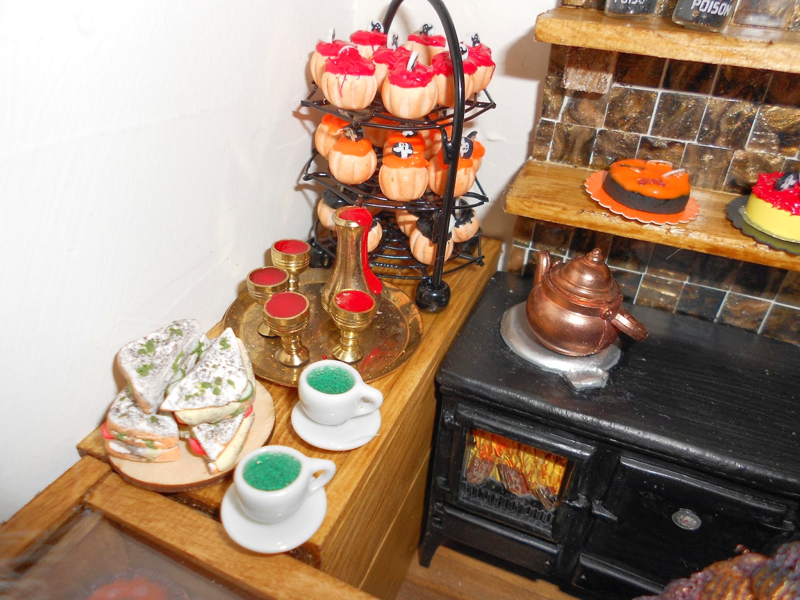 I have had a bit of a move around! As I bought Pumpkin cottage I decided to add a shelf upstairs and put that along with my little original witchy shop displayed on it. I was still really tight for space as taking that out still didn't give me enough room to add the new café as it was so much bigger. I didn't really want to extend the shelf much more as it would come over the light switch and I just felt it would look too much. In the end we decided a small curved shelf at the end on either side would give me a little bit more space without really making it look much different!